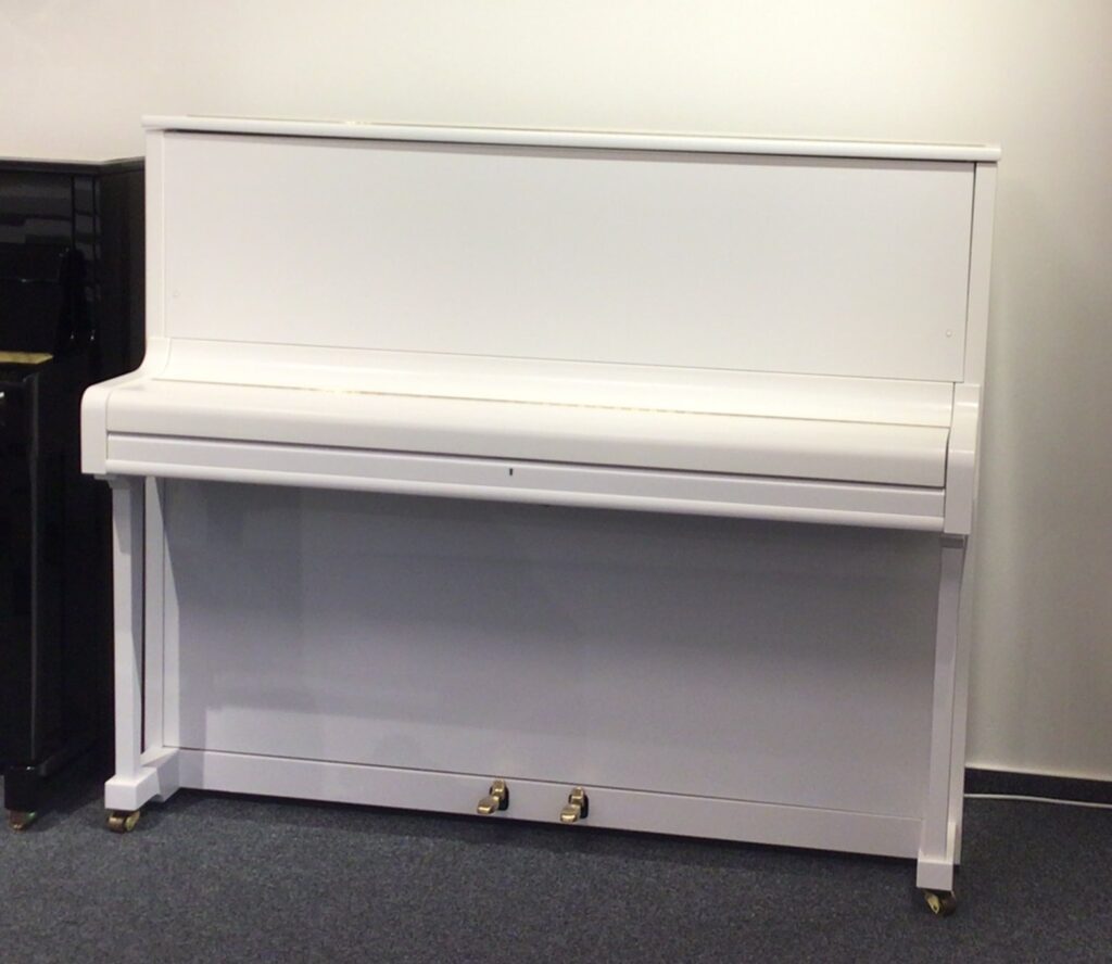 weiß satiniert mit Konsolen; breites Notenpult; einteilige Tastenklappe mit Schloss